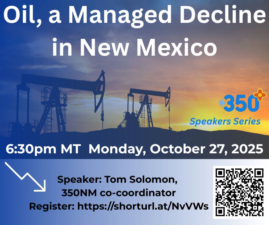 October 27, 2025. 350 New Mexico Co-coordinator Tom Solomon examines what a managed decline of oil production in NM would require; why it’s needed, how it would benefit us and how we’d fund state government and move to a sustainable economy.